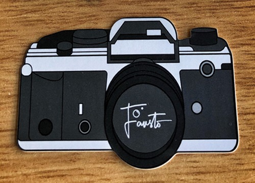 Diseño de tarjetas de visita creativas en forma de cámara, reforzando su identidad visual.